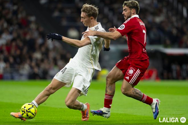 第37分鐘,居萊爾的傳中落點精準(zhǔn),貝林厄姆在干套之下頭球破門,打破僵局。